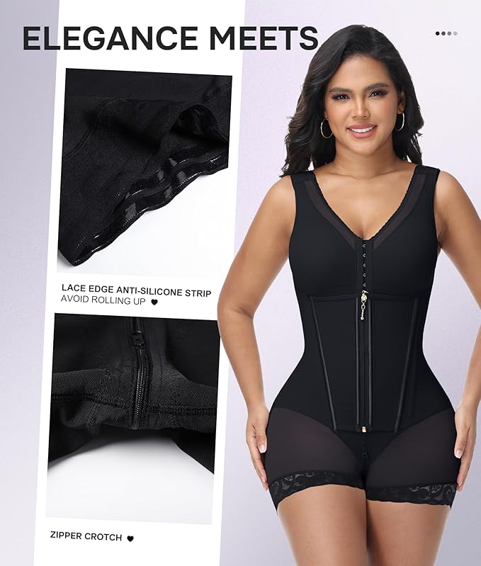 • COMFORT-FOCUSED DESIGN This faja body shaper tummy control features four adjustable shoulder straps to accommodate different body shapes and provide a secure fit. The crotch zipper offers convenience for restroom breaks, and the lace trim prevents curling. The single-layer fabric on the legs is breathable and lightweight, allowing for long-term wear without discomfort.
